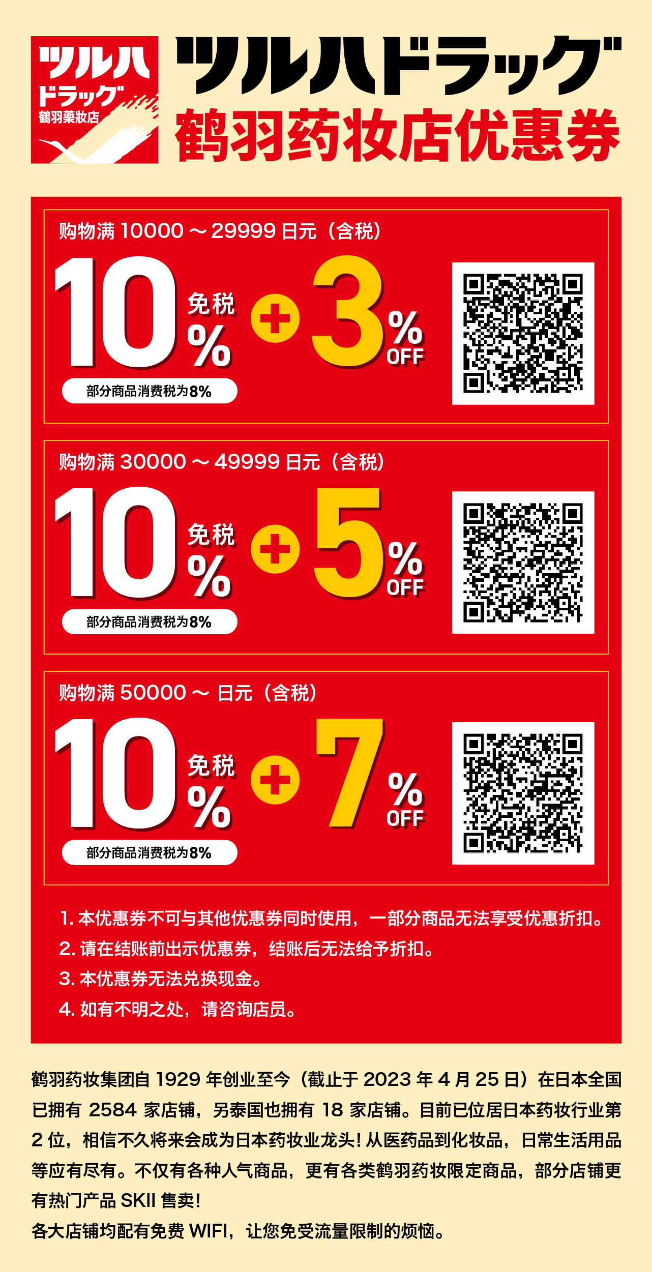 购物满50000~日元(含税)10%+7% OFF (部分商品消费税为8%);